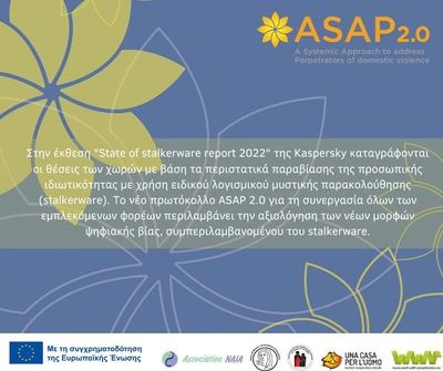 Στη 13η θέση μεταξύ των χωρών της Ε.Ε. που έχουν πληγεί από περιστατικά παραβίασης της προσωπικής ιδιωτικότητας, με χρήση ειδικού λογισμικού (stalkerware) βρίσκεται η Ελλάδα, σύμφωνα με την Έκθεση "State of stalkerware report 2022" της Kaspersky. Το νέο Πρωτόκολλο ASAP 2.0, στο οποίο συμμετέχει ο Σύνδεσμος Μελών Γυναικείων Σωματείων Union of Women Association και αναφέρεται στη συνεργασία πολλών Φορέων μεταξύ τους, αφορά και την αξιολόγηση των νέων μορφών ψηφιακής βίας, συμπεριλαμβανομένου του stalkerware.
