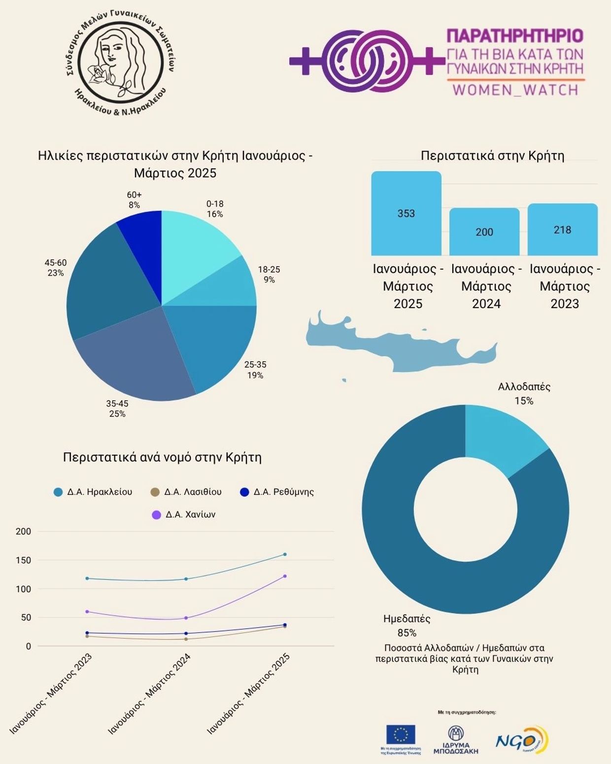 «Το έργο Παρατηρητήριο Για τη Βία Κατά Των Γυναικών στην Κρήτη – WOMEN’S WATCH υλοποιείται στο πλαίσιο του προγράμματος BUILD, με φορέα υλοποίησης τον Σύνδεσμο Μελών Γυναικείων Σωματείων Ηρακλείου και Ν. Ηρακλείου . Το πρόγραμμα «Building a robust and democratic civic space» (BUILD) έχει ως στόχο την προστασία, την προώθηση και την ευρεία αναγνώριση των θεμελιωδών δικαιωμάτων και αξιών της Ε.Ε., μέσω της στήριξης οργανώσεων της Κοινωνίας των Πολιτών (OKοιΠ) στην Ελλάδα και την Κύπρο και της ενίσχυσης των ικανοτήτων και της βιωσιμότητάς τους. Το BUILD συγχρηματοδοτείται από την Ευρωπαϊκή ‘Ενωση, μέσω του προγράμματος Citizens, Equality, Rights and Values (CERV), το Ίδρυμα Μποδοσάκη και το Κέντρο Στήριξης ΜΚΟ Κύπρου με συνολικό ποσό επιχορήγησης €2,9 εκ. Συντονιστής του BUILD είναι το Ίδρυμα Μποδοσάκη (Ελλάδα) σε σύμπραξη με το Κέντρο Στήριξης ΜΚΟ (Κύπρος)».